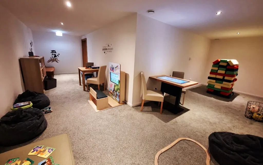 Indoor haben wir einen großen Kinderspielraum mit Spielecomputer, XXL Bausteinen, Büchern, Gesellschaftsspielen und vielem mehr